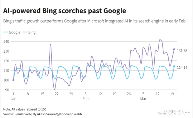 这些数字似乎表明,微软在与谷歌竞争生成性人工智能主导地位时取得了暂时领先优势,这要归功于ChatGPT背后的技术,这个聊天机器人被许多专家称为人工智能的“iPhone时刻”。