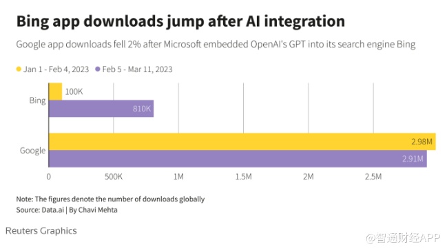 根据应用研究公司Data.ai的数据,在人工智能整合之后,必应的应用下载量也在全球范围内跃升了8倍。数据显示,谷歌搜索应用的下载量在同一时期下降了2%。