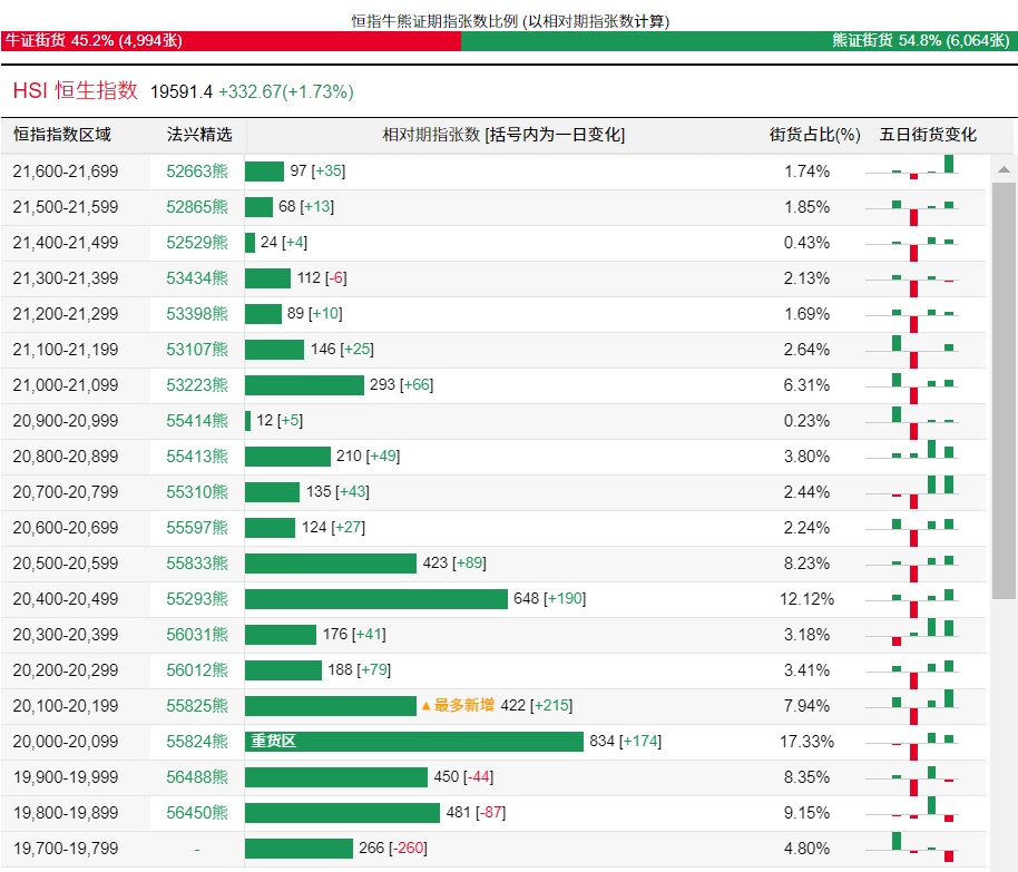 法兴恒指牛熊证街货分布图中的数据显示,熊证街货重货区在20000-20099区间,该区间最新熊证数量为834张,较上一交易日增加174张;最多新增在20100-20199区间,该区间最新熊证数量为422张,较上一交易日增加215张。