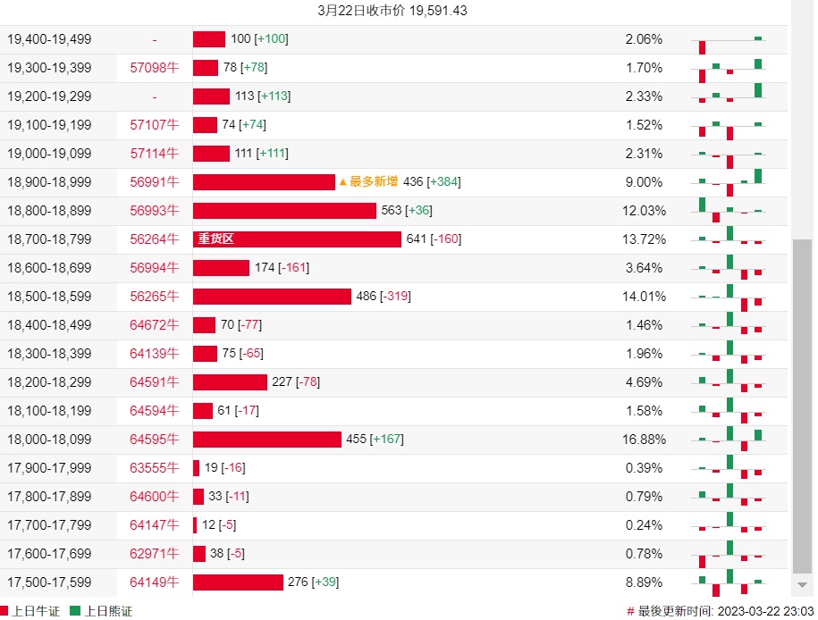 牛证街货重货区在18700-18799区间,该区间最新牛证数量为641张,较上一交易日减少160张;最多新增在18900-18999区间,该区间最新牛证数量436张,较上一交易日增加384张。