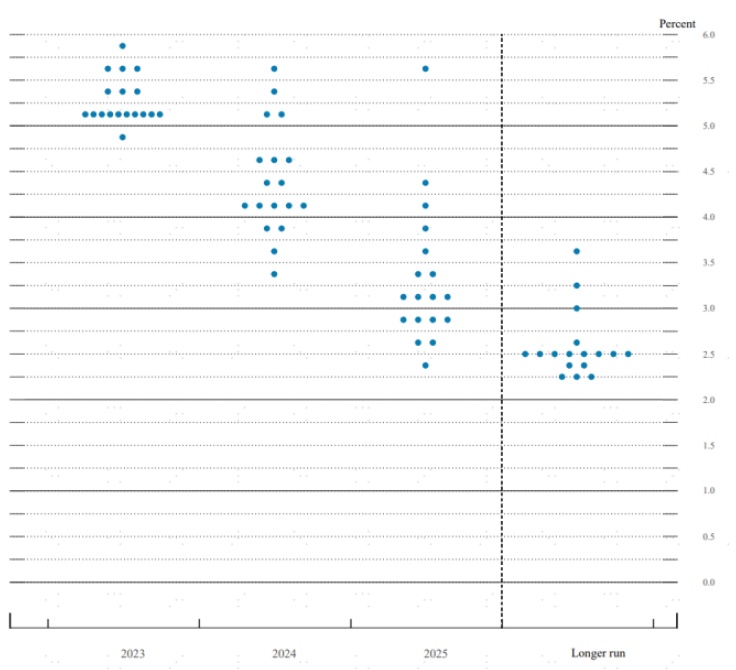 加息接近“终点线”,点阵图显示年内或还有一次加息。美联储在最新政策声明中修改了有关货币政策路径的表述,将“持续提高利率目标区间是适当的”改为“一些(some)额外的政策收紧可能(may)是适当的”,暗示加息已接近目标利率。鲍威尔在记者会上也再次强调了“一些”和“可能”的措辞,表明美联储希望对于未来加息路径、尤其是下次会议的利率决议保持较大灵活性。从点阵图来看,联储官员对2023年底的联邦基金利率中值预测保持在5.1%不变,由于目前利率已加至4.75-5.0%,这或意味着未来还有最后25个基点的加息。