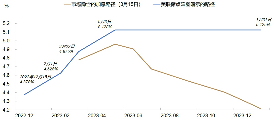 相比于美联储的“淡定”,市场并不认可,资产价格走势反映了市场对于未来更悲观的预期。虽然鲍威尔一再强调基准情形下2023年内不会降息,但目前利率期货市场却计入了美联储从年中开始降息的预期,根据该预期,联邦基金利率将在2024年中降至3%左右,这与美联储点阵图显示的4.3%相差甚远。此外,议息会议结束后美债收益率普遍下行,美元指数下跌,美股三大股指大幅下挫,说明市场或也不认为美联储的降息预期能够为风险资产起到托底作用。