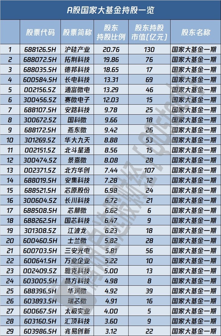 腾讯自选股查询iFinD发现,股东包含“国家集成电路产业投资基金股份有限公司”,也就是国家大基金一期的公司有沪硅产业等29家A股上市公司。