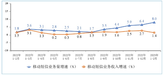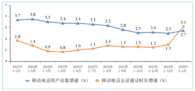 移动电话通话量低速增长,移动短信业务量增速持续回升。1—2月份,移动电话去话通话时长完成3583亿分钟,同比增长3.1%;固定电话主叫通话时长完成114.4亿分钟,同比下降5.2%。1—2月份,全国移动短信业务量同比增长8%;移动短信业务收入同比增长1.4%,增速较上年末分别提升1.6个和回落1.3个百分点。
