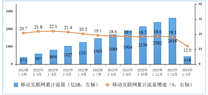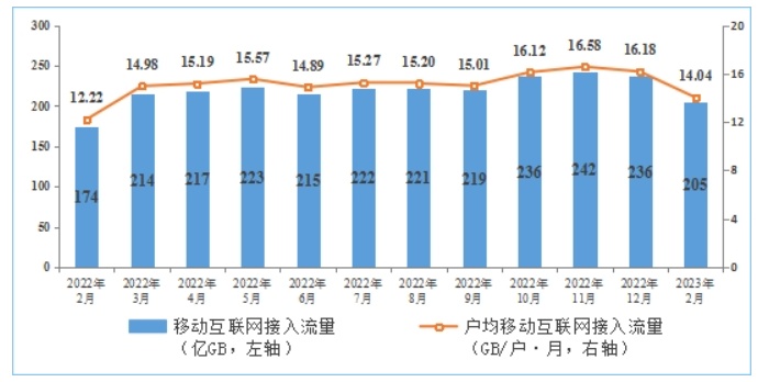 移动互联网流量增速有所回落。1—2月份,移动互联网累计流量达417.9亿GB,同比增长12%,增速同比回落8.7个百分点。截至2月末,移动互联网用户数达14.68亿户,比上年末净增1422万户。2月当月户均移动互联网接入流量(DOU)为14.04GB/户·月,同比增长14.8%,但较上年12月份低2.14GB/户·月。