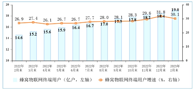 蜂窝物联网终端用户规模快速扩大,IPTV用户数稳步增加。截至2月末,三家基础电信企业发展蜂窝物联网终端用户19.05亿户,比上年末净增6004万户,占移动网终端连接数(包括移动电话用户和蜂窝物联网终端用户)的比重达52.9%。IPTV(网络电视)总用户数达3.85亿户,比上年末净增503.6万户。