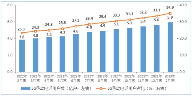 移动电话用户数稳中有增,5G用户占比不断提升。截至2月末,三家基础电信企业的移动电话用户总数达16.95亿户,比上年末净增1188万户。其中,5G移动电话用户达5.92亿户,比上年末净增3129万户,占移动电话用户的34.9%,占比较上年末提升1.6个百分点。