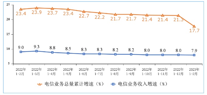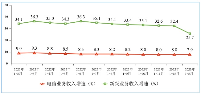 电信业务收入稳步提升,电信业务总量持续两位数增长。1—2月份,电信业务收入累计完成2803亿元,同比增长7.9%。按照上年不变价计算的电信业务总量同比增长17.7%。