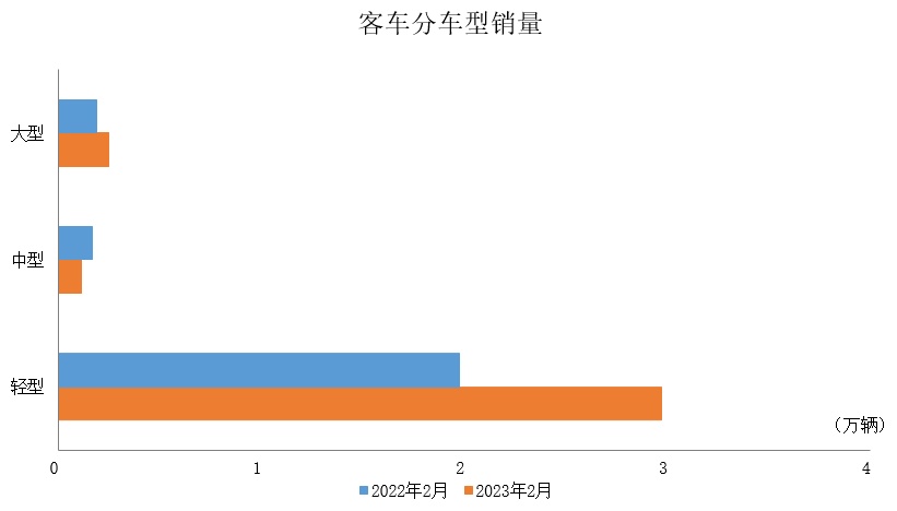 2023年2月,客车产销环比量均显著增长,同比均呈较快增长。在客车细分品种中,与上月相比,三大类客车品种产销呈不同程度增长,其中轻型客车产销增速更为明显;与上年同期相比,大型客车和轻型客车产销呈快速增长,中型客车产销明显下降。