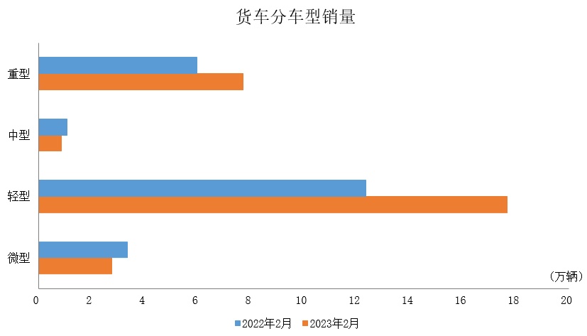 2023年2月,货车产销环比量均显著增长,同比均呈较快增长、但涨幅低于客车。在货车细分品种中,与上月相比,四大类货车品种产销均呈明显增长;与上年同期相比,重型货车和轻型货车产销呈较快增长,中型货车和微型货车产销呈两位数下降