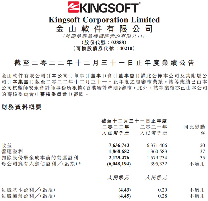 公司董事长雷军表示:“2022年充满挑战和不确定性,我们积极拥抱变化并保持战略定力,进一步强化我们的核心竞争力。金山办公集团专注服务组织级用户的数字化转型需求,着力提升个人用户的云办公体验,围绕‘多屏、云、内容、AI、协作’战略,经营业绩凸显韧性。网络游戏业务聚焦精品化,我们的旗舰游戏和新游戏都受到玩家欢迎。以上成绩赋予我们信心,进一步推进我们在企业级服务及网络游戏领域的战略落地。”