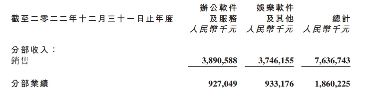 回到业绩,金山软件业务主要有两部分组成,即办公软件和网络游戏,两业务体量相当,2022年占比均在50%左右。
