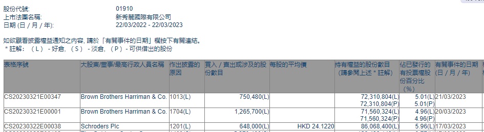 智通财经APP获悉,香港联交所最新资料显示,3月17日,Schroders Plc减持新秀丽(01910)64.8万股,每股作价24.1220港元,总金额约为1563.11万港元。减持后最新持股数目约为8606.84万股,最新持股比例为5.96%。