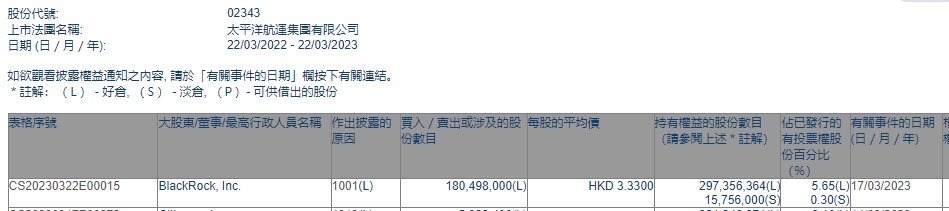 智通财经APP获悉,香港联交所最新资料显示,3月17日,贝莱德增持太平洋航运(02343)18049.8万股,每股作价3.33港元,总金额约为6.01亿港元。增持后最新持股数目约为2.97亿股,最新持股比例为5.65%。