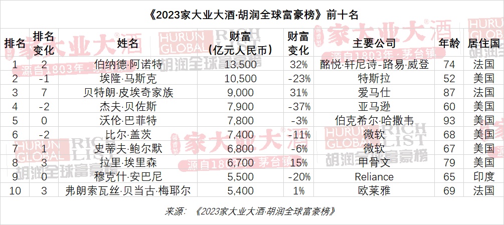 全球富豪榜前十名总财富比去年减少1,330亿美元,至1.2万亿美元,相当于8万亿元人民币,占全榜单的9%。其中6位来自美国,3位来自法国,1位来自印度。