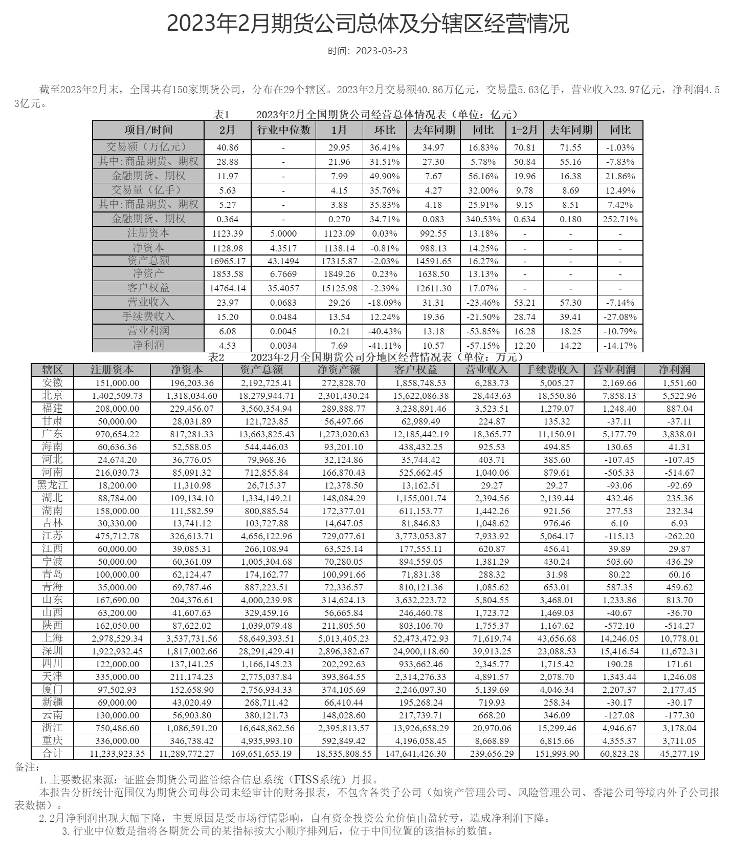 智通财经APP获悉,3月23日,中国期货业协会最新发布的2023年2月期货公司总体及分辖区经营情况显示,2月全国150家期货公司实现净利润4.53亿元,同比减少57.15%,环比减少41.11%;营业收入23.97亿元,同比减少23.46%,环比减少18.09%。