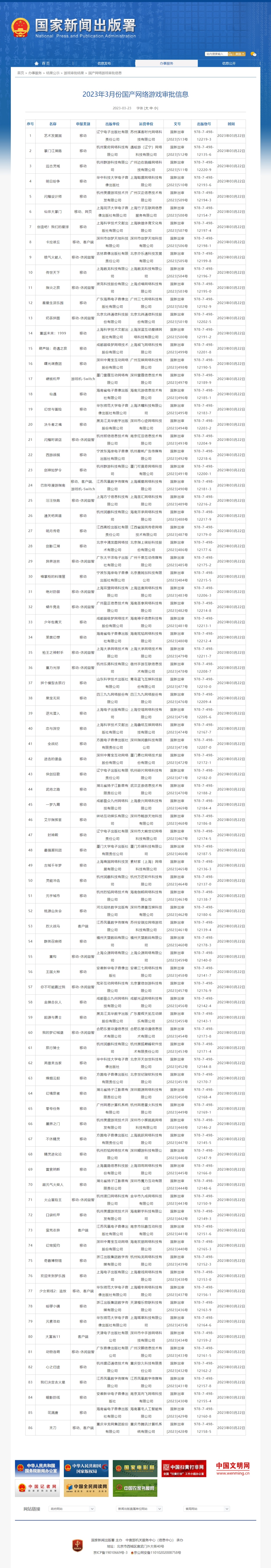 智通财经APP获悉,3月23日,国家新闻出版署发布2023年3月份国产网络游戏审批信息,共86款游戏获批。其中,包括网易(09999)的《零号任务》、腾讯(00700)的《末刀》、创梦天地(01119)的《卡拉彼丘》。