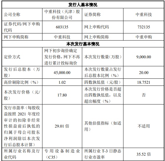 此前中重科技公告称,发行人和保荐人(主承销商)国泰君安将通过网下初步询价确定发行价格,网下不再进行累计投标询价。本次公开发行新股 9000.00 万股,占发行后发行人总股本的 20.00%。网下初始发行数量为 6300.00 万股,占发行数量的 70.00%,网上初始发行数量为2700.00 万股,占发行数量的 30.00%。
