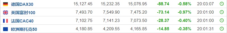 2. 截至发稿,德国DAX指数跌0.58%,英国富时100指数跌0.97%,法国CAC40指数跌0.40%,欧洲斯托克50指数跌0.35%。