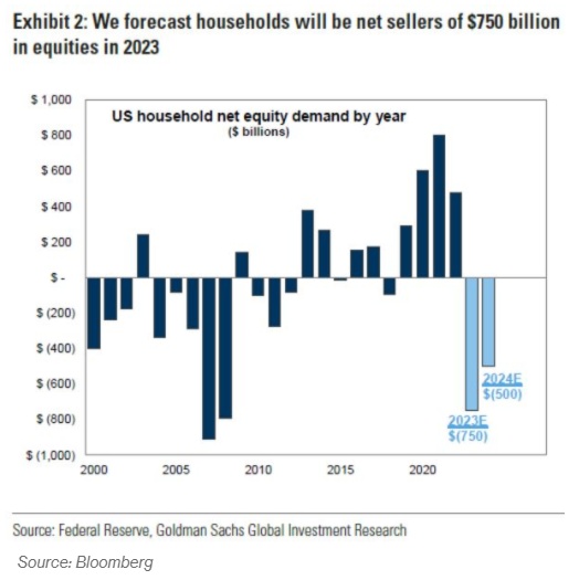 Conners为首的高盛策略师预计,由于债券收益率上升和储蓄减少,美国家庭今年将出售7500亿美元的股票,这将是自2018年以来需求首次出现下降。