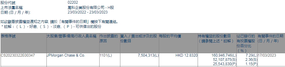 智通财经APP获悉,香港联交所最新资料显示,3月17日,小摩增持万科企业(02202)750.4313万股,每股作价12.8320港元,总金额约为9629.53万港元。增持后最新持股数目约为1.61亿股,最新持股比例为7.29%。