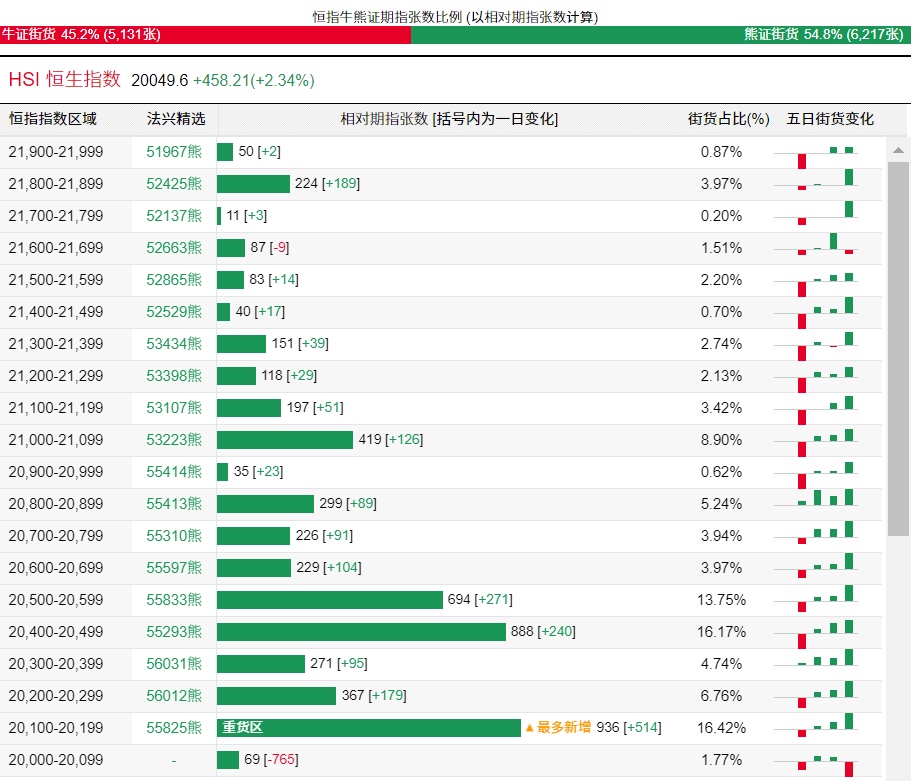 法兴恒指牛熊证街货分布图中的数据显示,熊证街货重货区在20100-20199区间,该区间最新熊证数量为936张,较上一交易日增加514张;最多新增亦在同一区间。