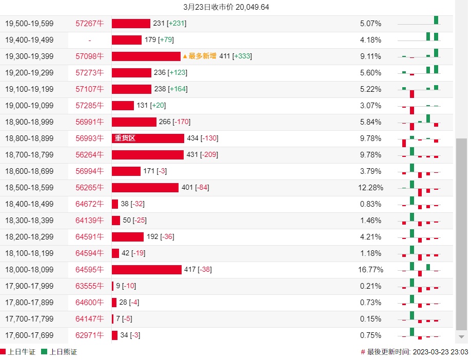 牛证街货重货区在18800-18899区间,该区间最新牛证数量为434张,较上一交易日减少130张;最多新增在19300-19399区间,该区间最新牛证数量411张,较上一交易日增加333张。