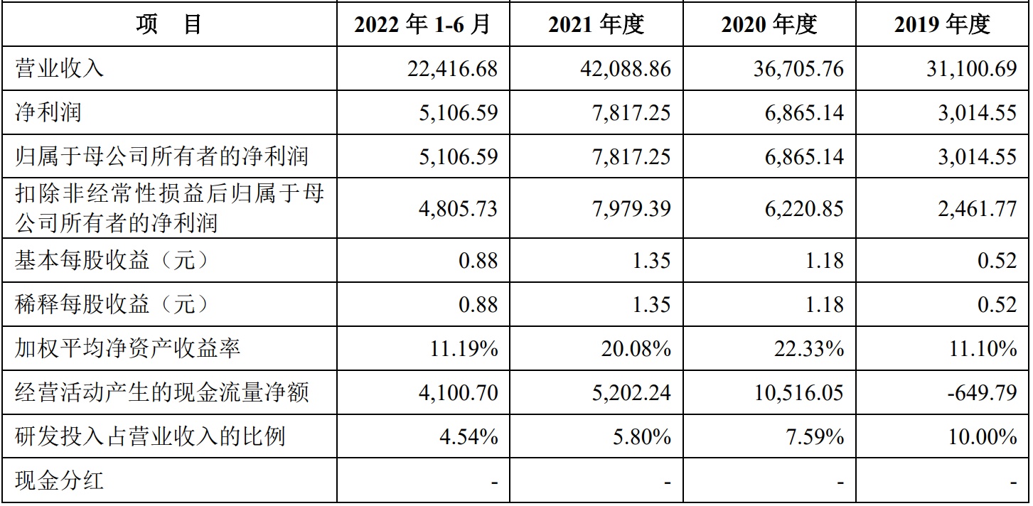 财务方面,于2019年度、2020年度、2021年度及2022年上半年,公司实现营业收入分别约为3.11亿元(人民币,下同)、3.67亿元、4.21亿元及2.24亿元;同期,公司净利润分别约为3014.55万元、6865.14元、7817.25万元及5106.59万元。