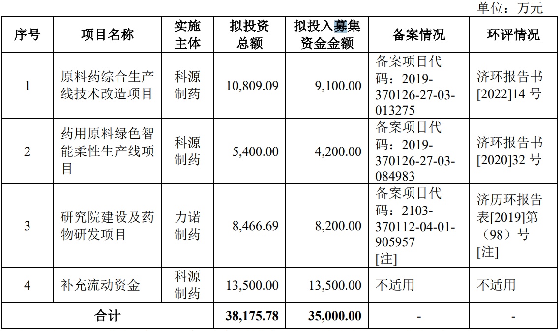 科源制药表示,本次发行募集资金扣除发行费用后拟投入以下项目: