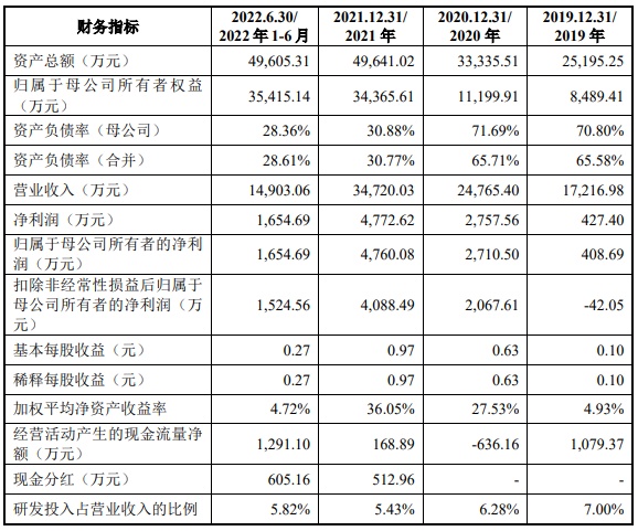 财务方面,于2019年度、2020年度、2021年度以及2022年1-6月,公司实现营业收入1.72亿元、2.48亿元、3.47亿元、1.49亿元。公司实现归母净利润分别为408.69万元、2710.5万元、4760.08万元、1654.69万元。