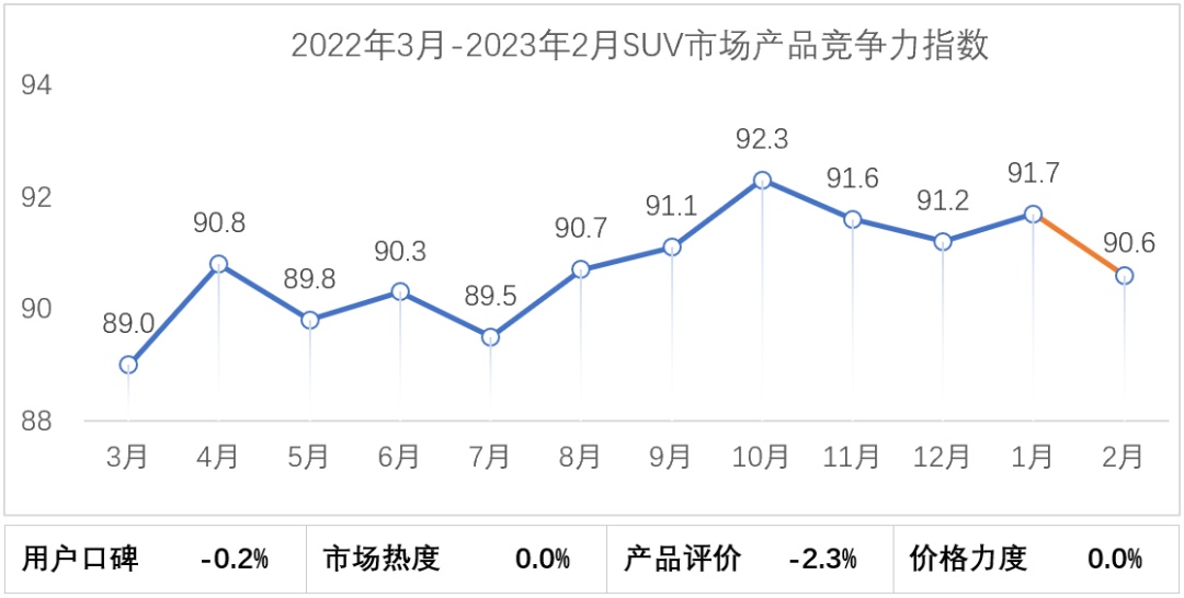 总体来看,2023年2月SUV市场产品竞争力指数为90.6,环比下滑1.1个点,其中产品评价和用户口碑指标环比分别下滑2.3和0.2个点,而价格力度和市场热度指标环比保持不变。