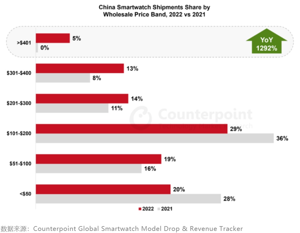 研究助理 Alicia Gong 补充说:“随着中国消费者对智能手表功能和体验的期望不断提高,入门级机型(<50美元,约合人民币350元)的份额正在逐渐下降。“