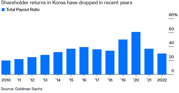 要知道的是,这些韩国公司并不是突然变得慷慨大方,也不是在激进投资者中寻找伙伴和董事会成员。高盛的数据显示,与亚洲其他国家相比,韩国企业通常会将更多的收益用于研发和资本支出(几乎占总收益的85%),而这是以牺牲股东回报为代价的。但随着政策制定者施加压力,他们面临这取悦日益强大的投资者群体的压力。