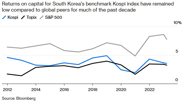 在过去十年的大部分时间里,韩国基准股指的资本回报率一直低于全球同类指数