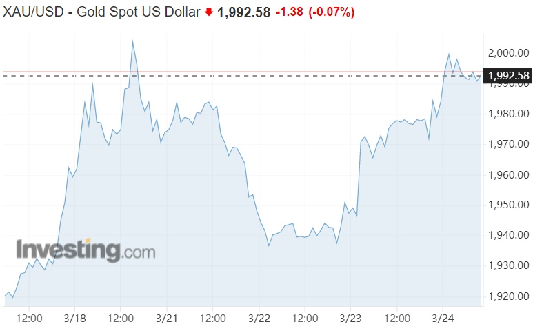 分析师补充说,黄金也应该继续受益于较低的债券收益率,因为他们预计美联储将在年底或2024年初降息。随着全球银行业危机搅乱金融市场,过去两周黄金避险需求回升。周一,黄金价格一度升至2000美元/盎司以上的12个月高点。目前,黄金现货价格也逼近2000美元/盎司。
