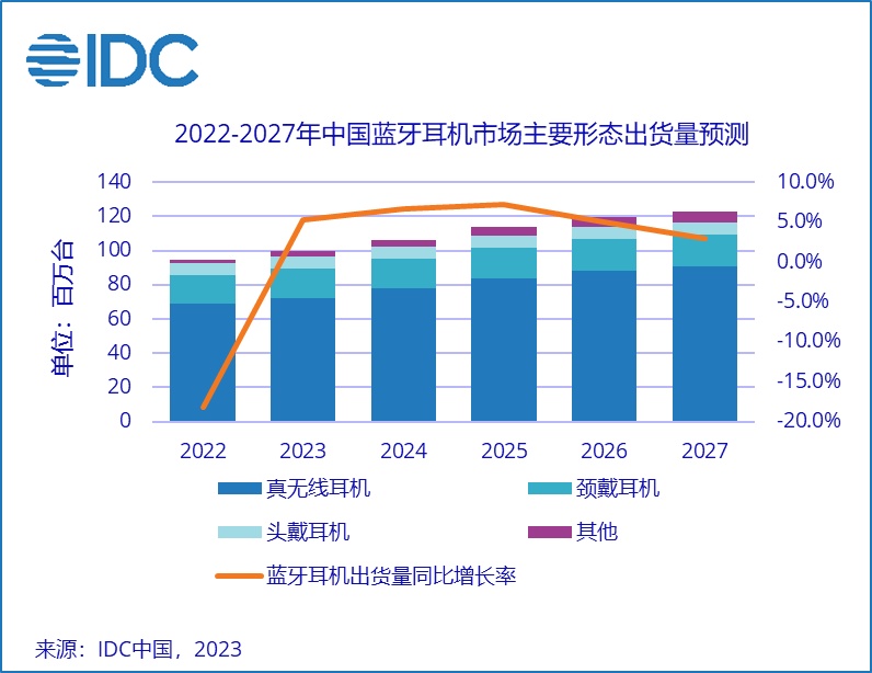 2023年蓝牙耳机市场预计小幅回升5%,随着渗透率不断提升,市场逐渐呈现饱和状态,在技术功能尚未出现明显革新的情况下,难以呈现大幅增长,而是逐渐开启结构性调整,延长发展周期,主要表现为以下三个方面: