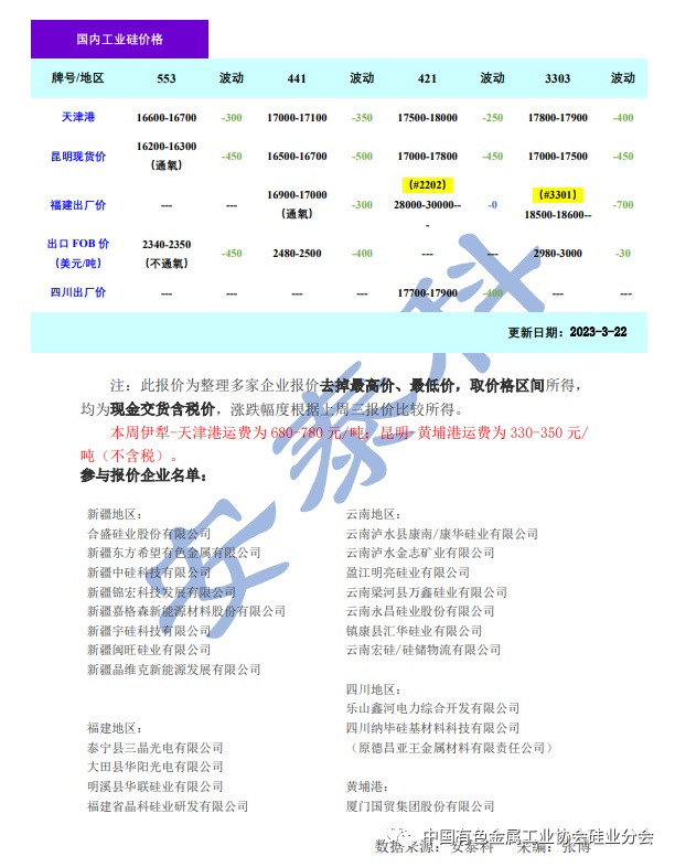 智通财经APP获悉,3月24日,据中国有色金属工业协会硅业分会数据显示,本周国内工业硅价格承压下行。其中,冶金级下跌300-500元/吨,主流价格在16200-17100元/吨;化学级下跌250-450元/吨,主流价格在17000-18000元/吨。同时,铝合金ADC12价格下跌200/吨,主流报价18500元/吨;有机硅DMC价格下跌500元/吨,主流报价16500元/吨。