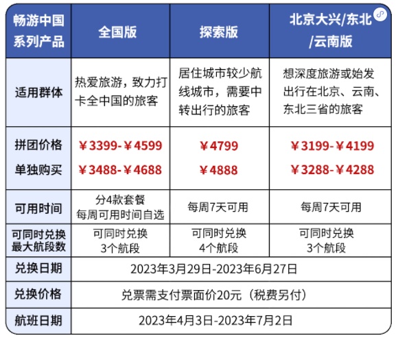 据了解,此次推出「随心飞」卖点为境内无限飞行、不限年龄、套餐任选,系列产品涵盖全国版(4日款、4+1款、4+2款、一周7日畅行款)、探索版、地区版(成都天府版、北京大兴版、东北版、云南版),不同产品在出行时间、可同时兑换最大航段数等方面存差异,售价在2499元至4888元不等。适用航班日期为2023年4月3日至7月2日,覆盖清明、五一和端午假期。
