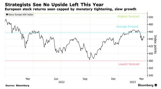 根据一项调查对17位预测人士的平均预期,欧洲斯托克600指数在今年迄今上涨4%后,到2023年底可能升至457点,这意味着该指数较周三收盘价仅上涨约2%。尽管多数策略师在经历了几周的动荡后,不愿大举改变市场预测,但一些此前看涨市场的参与者正变得更加谨慎。