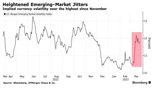 由于此前一系列银行倒闭引发了全球各地监管机构的干预,并导致全球市场波动,投资者感到震惊。纽约市场上,衡量发展中国家货币和股市隐含波动率的指标在周四有所上升。