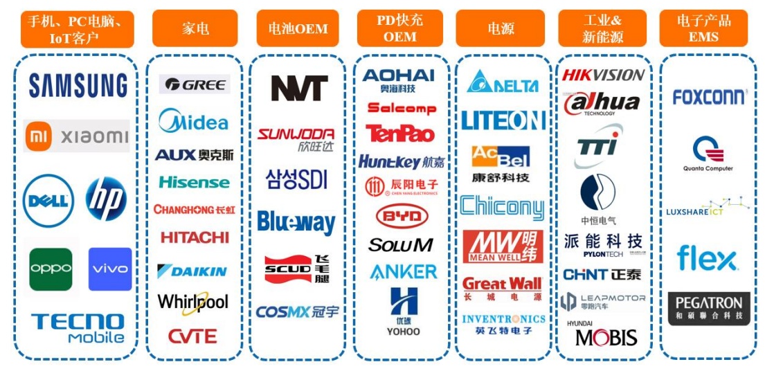 等数十家国内外知名的智能手机品牌商、可穿戴设备厂商、电源厂商、家电集团、电动工具制造商的产品中。