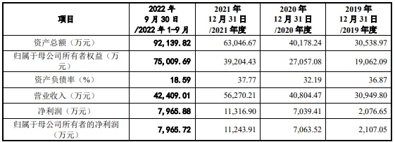 财务方面,于2019年度、2020年度、2021年度及2022年1-9月,公司实现营业收入分别约3.09亿元、4.08亿元、5.63亿元、4.24亿元;净利润分别约为2076.65万元、7039.41万元、1.12亿元、7965.88万元。