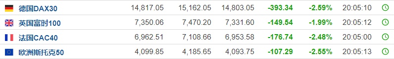 2. 截至发稿,德国DAX指数跌2.59%,英国富时100指数跌1.99%,法国CAC40指数跌2.48%,欧洲斯托克50指数跌2.55%。