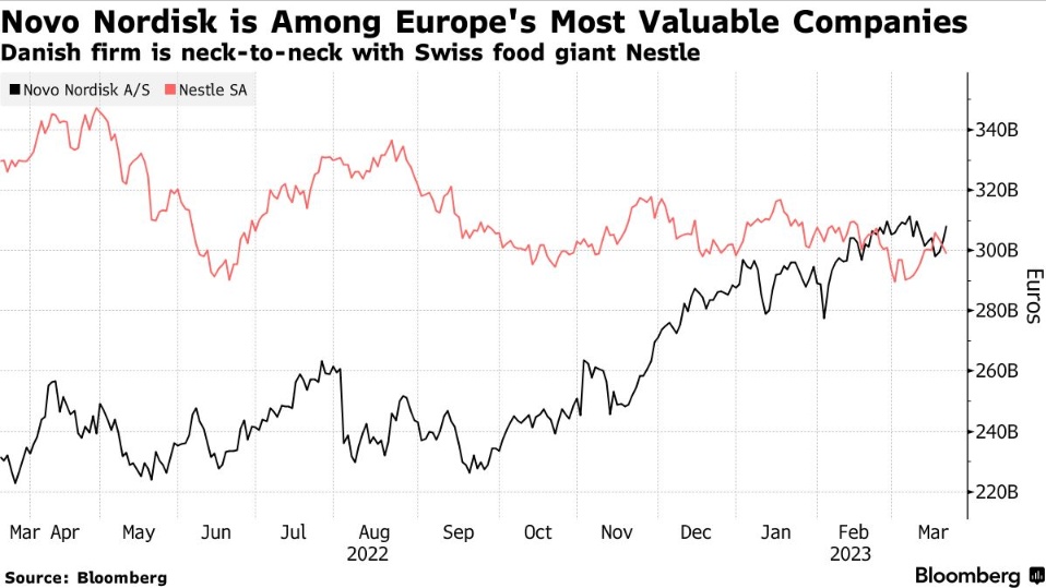 据了解,司美格鲁肽(商品名:Ozempic、Wegovy)是一种GLP-1受体激动剂,2022年大卖了108.82亿美元,几乎赶上诺和诺德总营收的一半,其市值飙升至2.3万亿丹麦克朗(合3360亿美元),成为欧洲第二大最有价值的公司,并将拥有160年历史的瑞士企业集团雀巢(NSRGY.US)挤出第三位。其中Ozempic适用于降糖,2022年销售额为597.5亿丹麦克朗(84.39亿美元),Wegovy与Ozempic剂量不同,适用于减肥,2022年销售成绩为106.76亿丹麦克朗(15.13亿美元)。