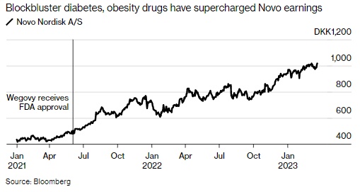 虽然这家制药商仍然落后于市值4480亿美元的奢侈品公司路威酩轩集团(LVMH),后者是欧洲市值最大的公司。然而,诺和诺德在短短两年内就从第七位攀升,周四股价创下历史新高,达到每股1025丹麦克朗(合150美元)。