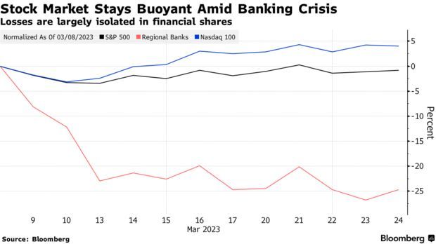 只不过,在当下做到这一点需要近乎英雄般的镇定。在短短几周内,市场主题已经从“不着陆”(即经济继续增长、劳动力市场强劲和通胀难以消退)转变为银行业混乱和经济衰退,再到美联储推动的某些形式的科技股复苏。