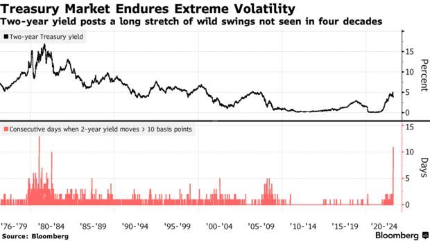 对经济前景和美联储政策路径不断变化的看法令美债经历几乎前所未有的动荡。截至周四,两年期美债收益率连续第11个交易日波动超过10个基点,为1981年以来最剧烈的波动。在这11个交易日中,该收益率有7天是上涨、4天是下跌的,这令多头和空头都感到痛苦。