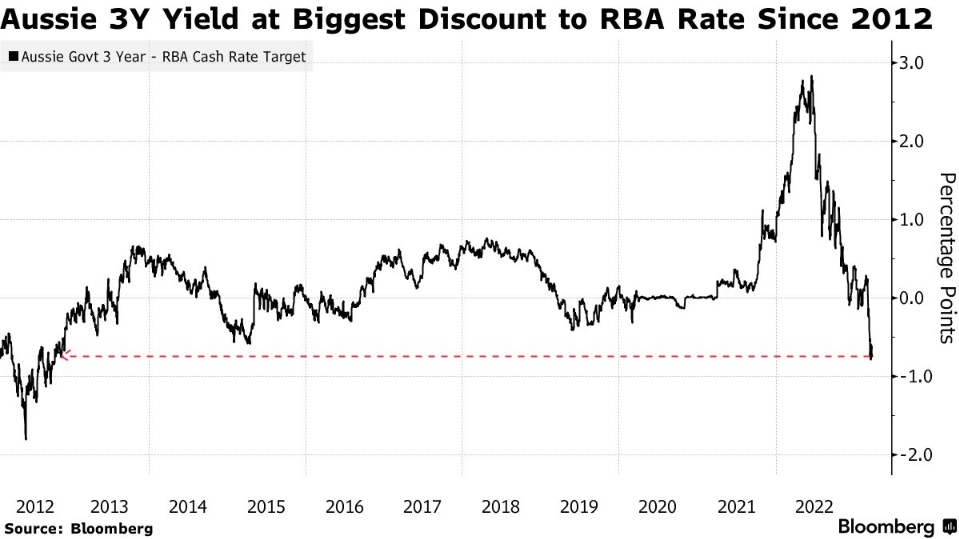 如下图所示,澳大利亚三年期国债收益率已跌至低于澳大利亚央行基准利率逾70个基点的水平,为10年来的最高水平,市场押注债券到期时利率将更低。