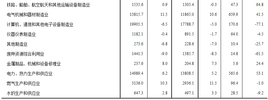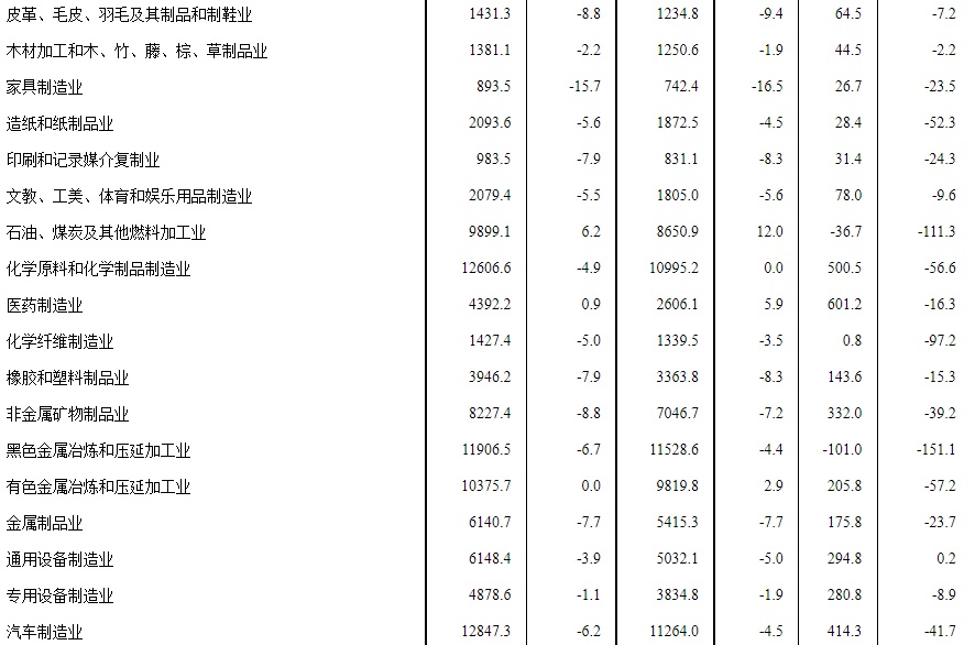 1—2月份,在41个工业大类行业中,10个行业利润总额同比增长,1个行业减亏,28个行业下降,2个行业由盈转亏。主要行业利润情况如下:电力、热力生产和供应业利润总额同比增长53.1%,电气机械和器材制造业增长41.5%,石油和天然气开采业增长8.6%,通用设备制造业增长0.2%,煤炭开采和洗选业下降2.3%,农副食品加工业下降6.3%,专用设备制造业下降8.9%,纺织业下降37.1%,非金属矿物制品业下降39.2%,汽车制造业下降41.7%,化学原料和化学制品制造业下降56.6%,有色金属冶炼和压延加工业下降57.2%,计算机、通信和其他电子设备制造业下降77.1%,石油煤炭及其他燃料加工业、黑色金属冶炼和压延加工业均由盈利转为亏损。