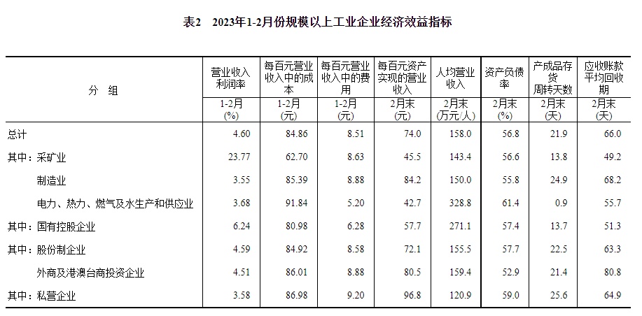 2月末,规模以上工业企业每百元资产实现的营业收入为74.0元,同比减少7.1元;人均营业收入为158.0万元,同比增加0.6万元;产成品存货周转天数为21.9天,同比增加2.1天;应收账款平均回收期为66.0天,同比增加7.3天。